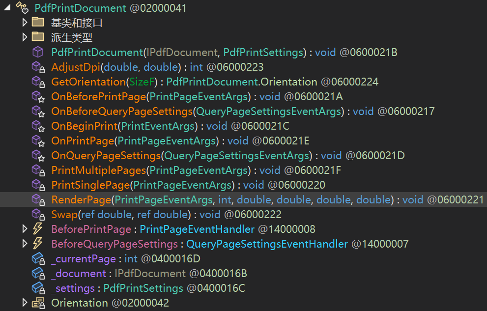 ② 找到 PdfPrintDocument 类,展开,再找到 RenderPage 方法: